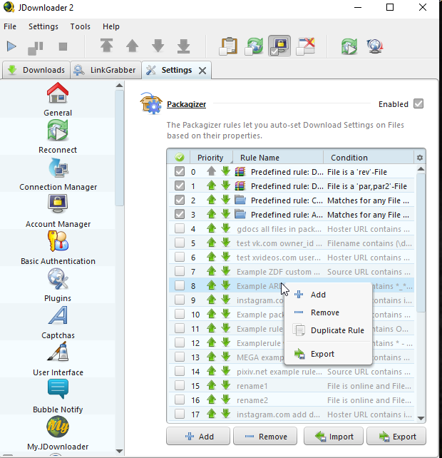 On the bottom right corner, you will find two buttoms to import/export packagizer rules.