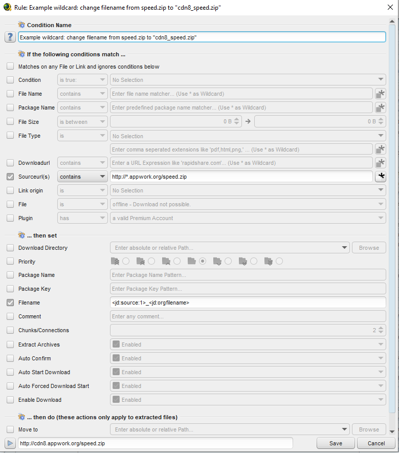 The following rule will append "JDAwesome_" to all files from source "appwork.org" which are online.